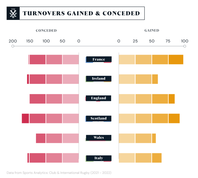 Another strong aspect of France’s play, so often linked to Six Nation winning sides, was a ruthless attitude to turning the ball over. France were clinical and acquired a grand total of 96 turnovers in their five Test matches. Aldritt, again, is building an international reputation that sets him apart as one of the best back-row players on display at the World Cup in 2023. He was the difference at breakdown on numerous occasions. With six turnovers, he tops this particular ranking at the Six Nations this year (alongside Maro Itoje, Toa Halafihi and Alex Dombrandt). Jonathan Danty, who put in a series of impressive performances, comes second with five.