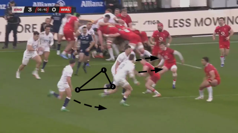 England run a typical shape utilising all three players in structured attack. Accurate decisions in the teeth of traffic, and the ability to offer all three options with equal facility are key to its success.
