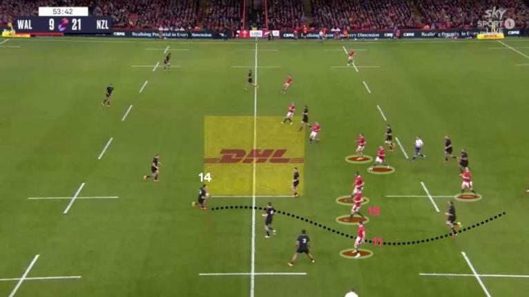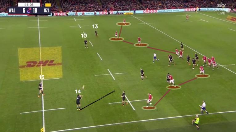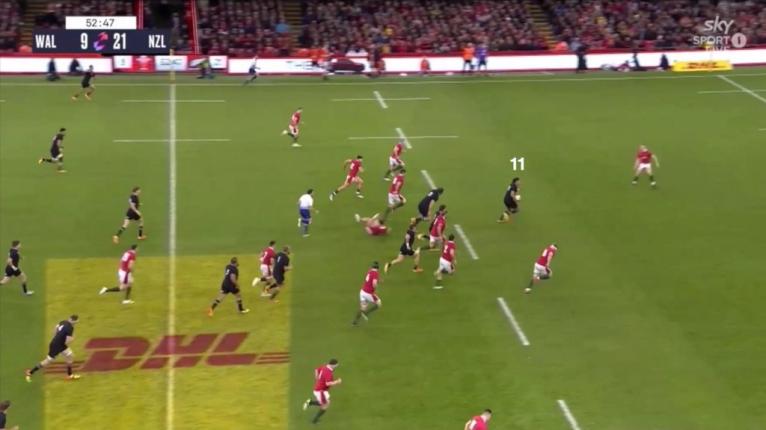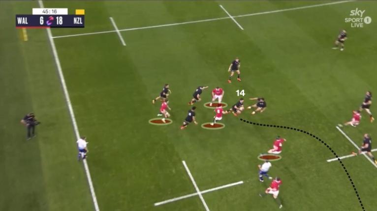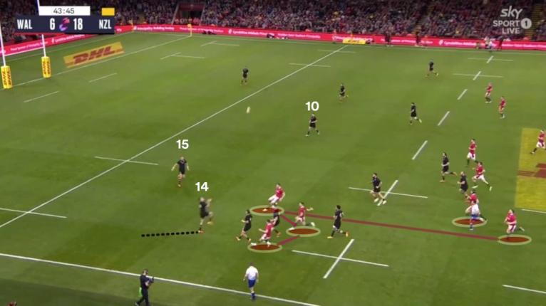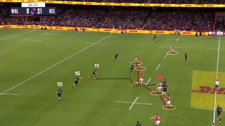 Ioane targets Basham (7), who was vulnerable to the left foot step because he was moving laterally to cover the aforementioned gaps. The All Blacks wing beats him on the inside and, despite tripping, broke upfield out of the clutches of the nearest defender.