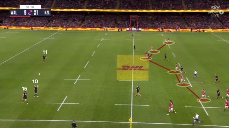 Wales’ kick-chase line had a massive seam between the first arriving unit and the rest. Although three defenders should have been enough to contain Jordan, they had to let him land and Tomos Williams (9) did a poor job wrapping him up.