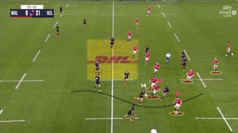 Players were getting up off the ground at different times and were bunched together, which made the Welsh line very thin on the edges, yet the need is immediate to push forward if the ball is still in play.