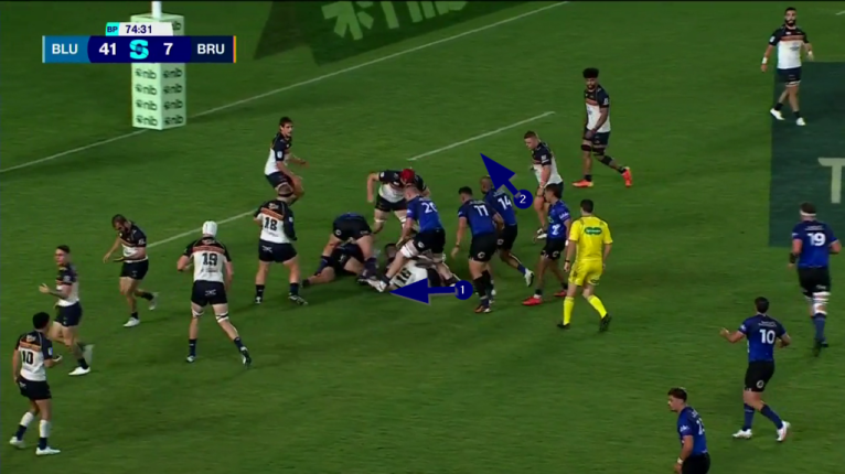 Clarke again carries three men over the goal line with him in the first instance, while the second illustrates the Blues’ outstanding ability to double up in heavy traffic on two successive carries: although Telea slips while changing direction on the initial run, he has another ‘hard yakker’ to back up the carry in the form of Sotutu on second phase.
