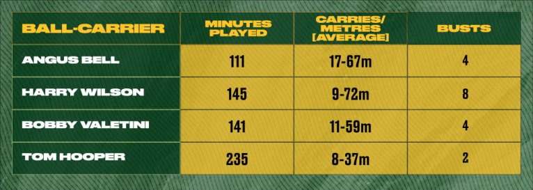 Although he comes off the pine, Bell is the real workhorse carrier, averaging six more carries than Bobby Valetini and eight more than skipper Harry Wilson during his time on the paddock. Bell and Alaalatoa on the field together represent the ideal combination of one carrying prop and one cleaner, and that mix could be mirrored by the pairing of Aidan Ross and the Tongan Thor off the bench.