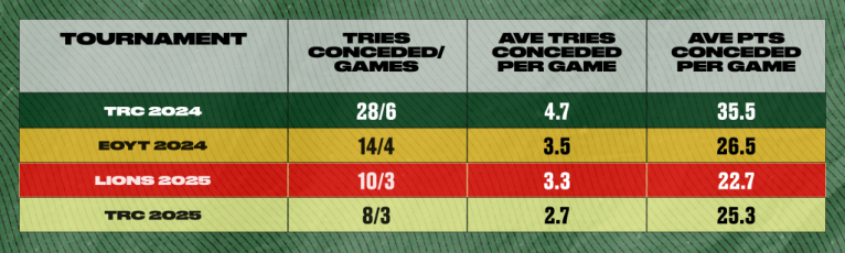 Where Australia required an average of 49 rucks to score a try in the 2024 Rugby Championship, and 38 to score one versus the Lions, their scoring potential in the 2025 tournament thus far has exploded: one score for every seven rucks set, with 11 of their 13 tries coming in four phases or fewer and 54% converted from unstructured situations outside set-piece.