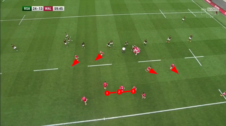 The first pass hits Wales’ main forward ball-carrier, #8 Aaron Wainwright, firmly on the left shoulder and checks his run into contact. After only two phases, there are four Welsh players with their backs to the #9, running away from the ruck when the ball is ready to be played. The only vestige of structure is a forward pod fully 10 metres behind the site of the breakdown. With so much advance notice, it is easy to see why Wales are robbed of the possession by the Springboks on next phase.